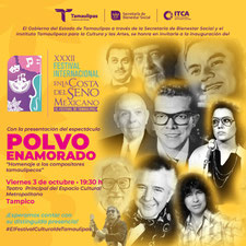 La inauguración oficial a cargo del gobernador Américo Villarreal Anaya tendrá lugar en el Espacio Cultural Metropolitano de Tampico, donde se presentará el espectáculo especial “Polvo enamorado”, una producción original que reúne a destacados artistas tamaulipecos de trayectoria nacional e internacional como Carmen Sarahí, Polo Rojas, Jupiter Bautista, Pepe Navarrete, Héctor Gamaliel, Cynthia Sánchez e Isabelle Govea. Este concierto rendirá homenaje a compositoras y compositores que han marcado la historia musical del estado, entre ellos Cuco Sánchez, Roberto Cantoral, Rigo Tovar, Lolita de la Colina, Rockdrigo González y Juan García Esquivel.