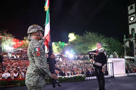 Desde la escalinata principal de Palacio de Gobierno, el gobernador de Tamaulipas recibió la bandera nacional de manos de la escolta del 77 Batallón de Infantería y exclamó.